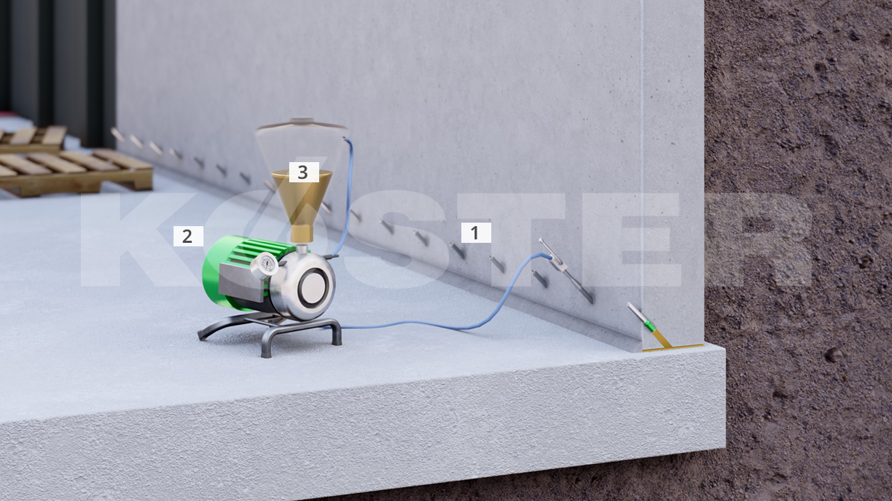 Em caso de água corrente ou quando não há certeza se a rachadura está seca ou molhada, KÖSTER 2 IN 1 é injetado. KÖSTER 2 IN 1 é um produto único certificado pela CE, que em fissuras secas forma uma resina de corpo sólido, em fissuras úmidas uma espuma substituindo a água. Isso economiza tempo e logística no canteiro de obras. É injetado duas vezes, com 10 a 20 minutos de intervalo, para garantir que a junta seja selada de forma permanente e elástica.
