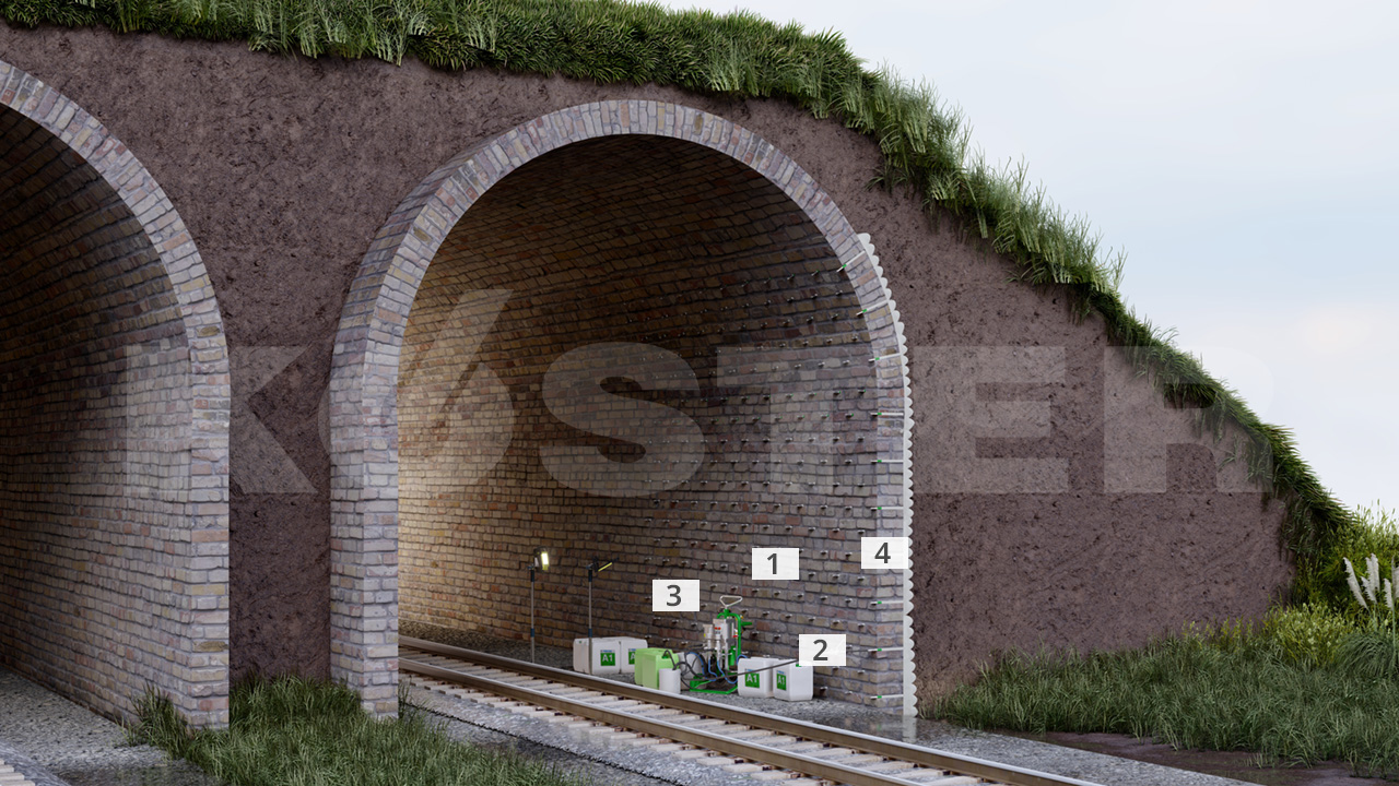Semelhante às estruturas de alvenaria padrão, os túneis de alvenaria construídos com pedra natural ou tijolo também podem ser injetados. Os furos são perfurados em uma grade horizontal e verticalmente a cada segunda linha de deslocamento e os KÖSTER Superpackers são inseridos nos furos. Na maioria dos casos, é necessário instalar uma barreira de injeção, por exemplo, com KÖSTER Injection Barrier, para evitar a perda de material de injeção devido à saída descontrolada.