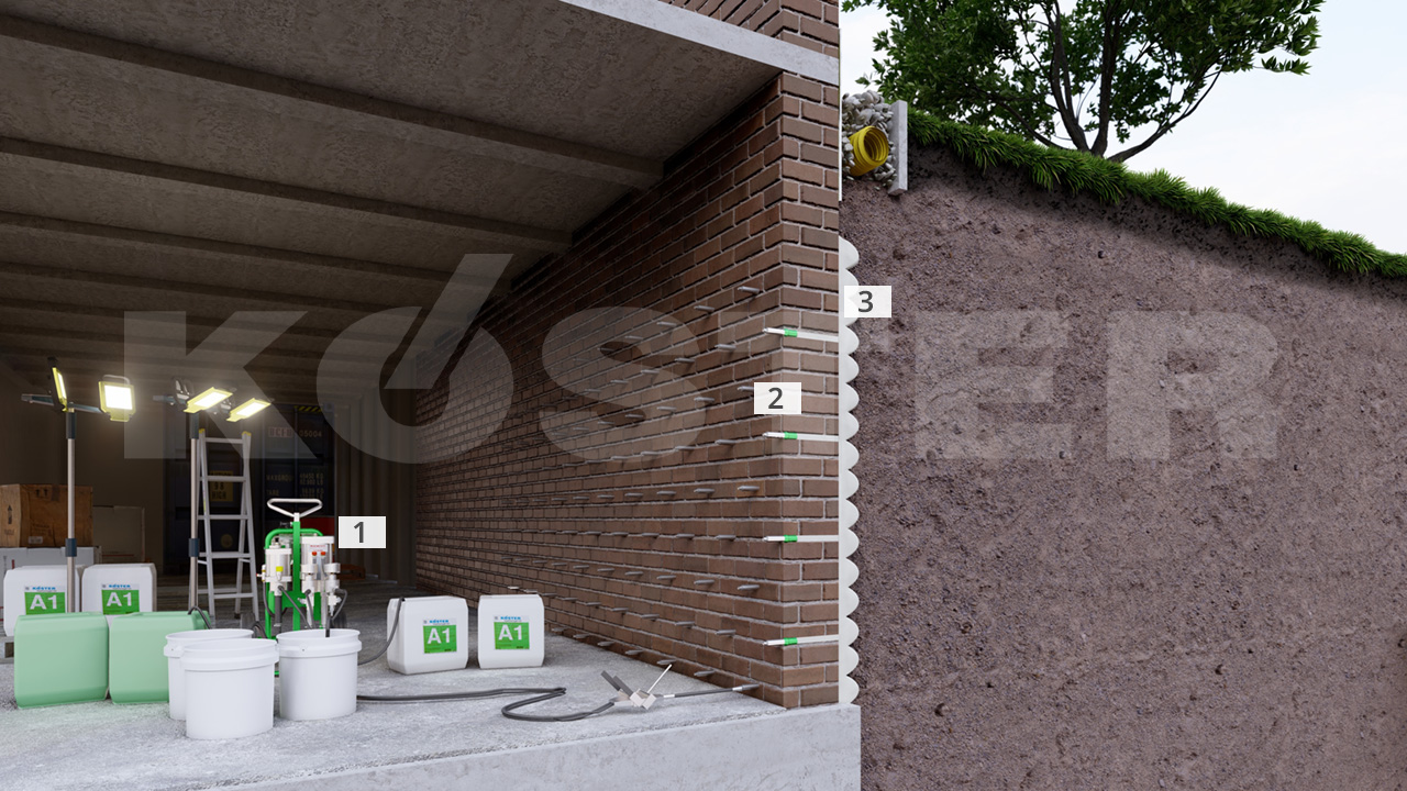 Nestes casos, é possível uma injeção de cortina com KÖSTER Injection Gel G4: A resina é injetada através da parede de dentro para fora. A água presente atrás da parede não representa um desafio para os géis de injeção KÖSTER, pois eles não reagem com ela, mas, em vez disso, fica preso em sua matriz, resultando em um corpo sólido elástico à prova d'água.