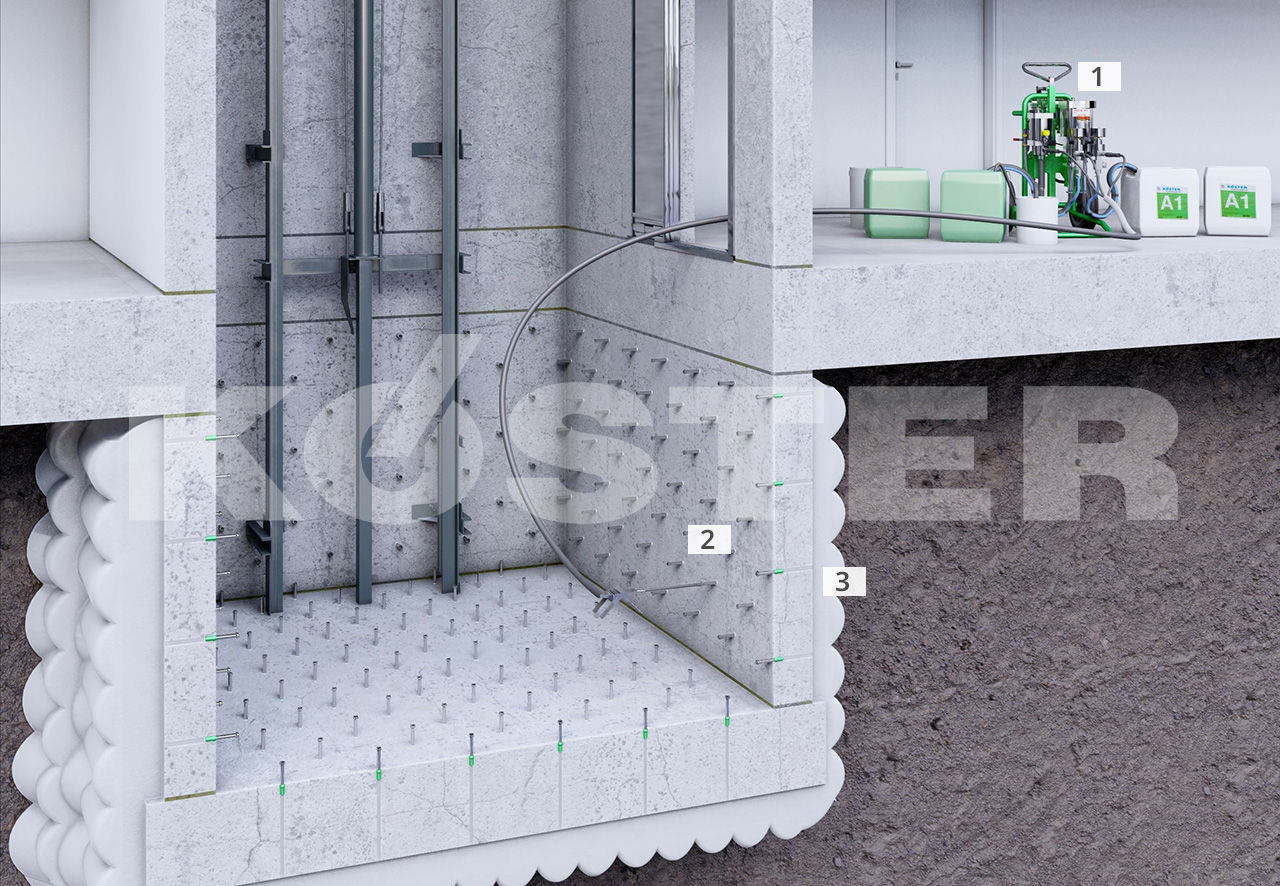 A impermeabilização subsequente de componentes do edifício que não são acessíveis devido à construção vizinha ou outras considerações (como túneis, garagens subterrâneas, poços de elevadores ou lajes de base de concreto), é comumente realizada através do método de impermeabilização conhecido como injeção de cortina. O gráfico acima mostra um poço de elevador sendo posteriormente impermeabilizado por injeção de cortina horizontal (abaixo da laje de base de concreto) e por injeção de cortina vertical (através das paredes).