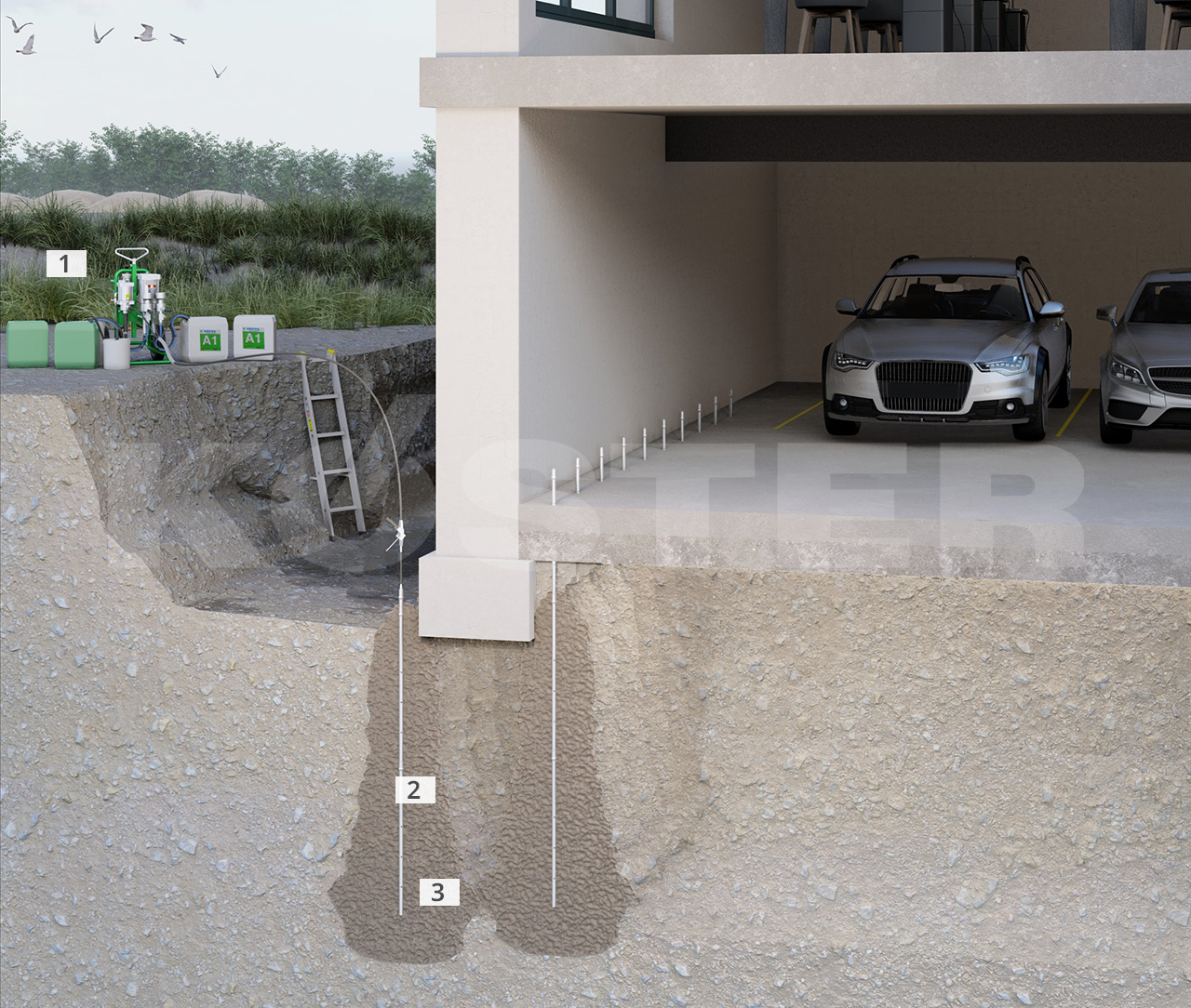 Para reduzir a perda dos finos do subsolo, deve ser realizada uma estabilização do solo. Esta estabilização é realizada com a injeção de KÖSTER Injection Gel G4 através de lanças de injeção especiais. A baixa viscosidade do gel permite uma penetração profunda e distribuição do material entre a matriz do grão, ligando o solo e a água em um corpo elástico de gel-solo. O resultado é uma composição de solo mais estável e impermeabilizada sem o risco de lavagem dos finos.