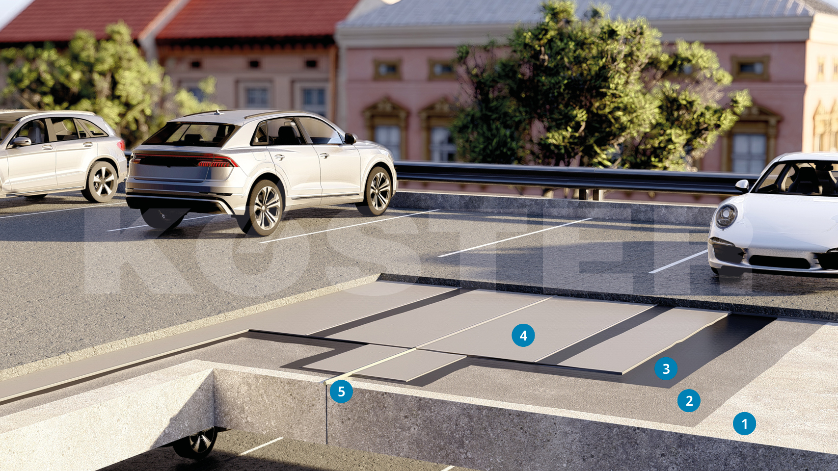 O sistema KÖSTER Car Parking and Bridge Deck Waterproofing consiste na resina epóxi de dois componentes KÖSTER CT 225 Bridge Deck Coating e nas membranas elásticas KÖSTER ECB 2F Waterproofing.