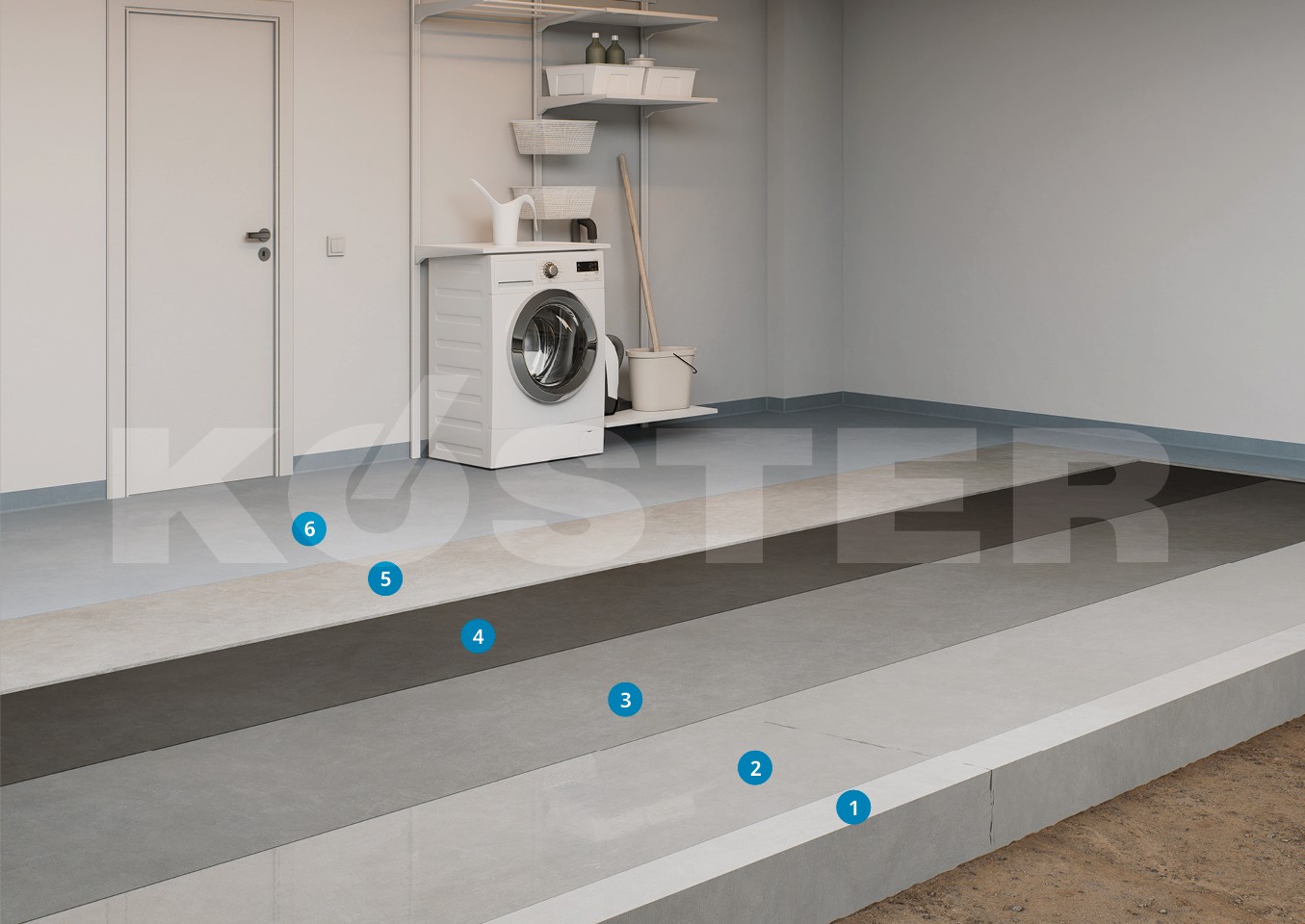 O sistema de impermeabilização para pisos autonivelantes começa com a preparação da superfície do substrato de concreto. Inicialmente, o substrato preparado recebe uma imprimação com KÖSTER Polysil TG 500, que endurece o substrato e reduz a mobilidade dos sais. Após a imprimação e a cura, segue-se uma aplicação de duas camadas de argamassa impermeabilizante KÖSTER NB 1 Grey (2 x 1,5 kg/m²). Ela proporciona uma impermeabilização mineral cristalizante, estanque e adequada para aplicações tanto no lado positivo quanto no negativo. É conhecida por sua alta resistência à pressão, abrasão e produtos químicos. Em seguida, é aplicada uma impermeabilização de duas camadas de KÖSTER NB 4000 (2 x 1,2 kg/m²), que oferece proteção elástica e antitrincas que resiste à água pressurizada após 24 horas e é ideal para diversas estruturas, incluindo porões e fundações. Opcionalmente, o sistema é revestido com KÖSTER SL Flex, uma base autonivelante de alta qualidade, de presa rápida e autonivelante que forma uma superfície lisa e de alta resistência, adequada para diversos acabamentos, como carpetes ou azulejos, e até mesmo sistemas de aquecimento de piso. Neste caso, o KÖSTER SL Flex foi projetado para aplicação em espessuras superiores a 8 mm e máximas de 15 mm. O KÖSTER CT 215 Universal Floor pode ser usado como piso final. O KÖSTER CT 215 Universal Floor é uma resina epóxi à base de água, isenta de solventes, desenvolvida para preparar e revestir superfícies de concreto, oferecendo não apenas proteção, mas também um acabamento fosco sedoso que aprimora a estética e garante fácil manutenção, proporcionando um acabamento durável, de fácil manutenção e permeável ao vapor. Sempre siga as especificações nas respectivas Fichas Técnicas. Para obter instruções detalhadas de instalação, consulte a Ficha Técnica do Sistema mais recente.