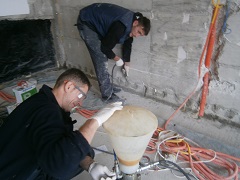 Injektiranje radnih prekida betoniranja, odnosno spojeva podne ploče i vertikalnih zidova. Izvedeno s 2K poliuretanskom pjenom koja u dodiru s vodom trenutno bubri i volumenski ekspandira do 30 puta.