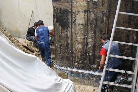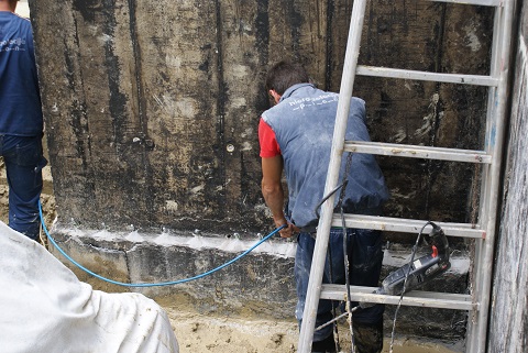 Injektiranje na mjestima prekida betoniranja elastičnom poliuretanskom smolom Köster 2 IN 1. Smola se injektira pumpom za injektiranje pod visokim tlakom (cca 150 bar-a), putem pakera Köster Superpacker koji se buše u zid pod kutem od 45° (kako bi se presijekla pukotina, odnosno spoj starog i novog betona).